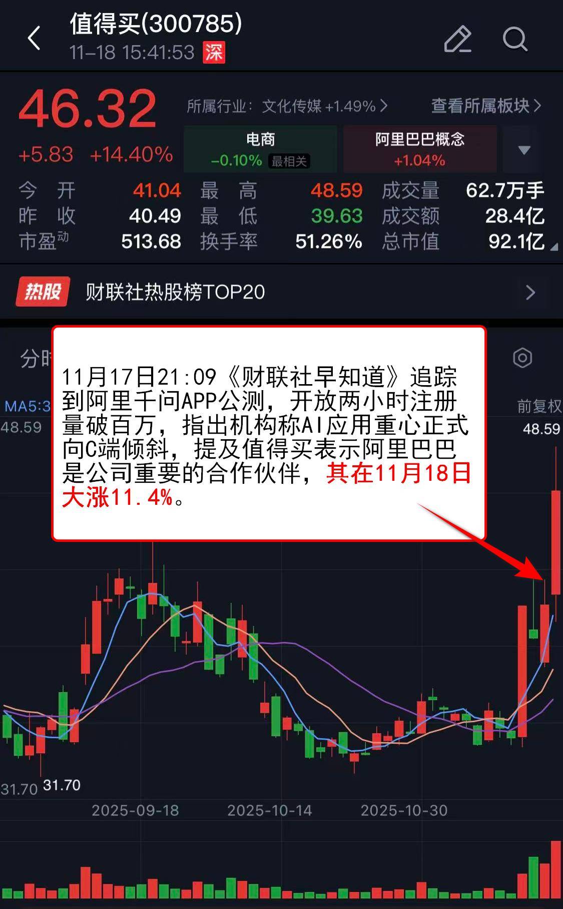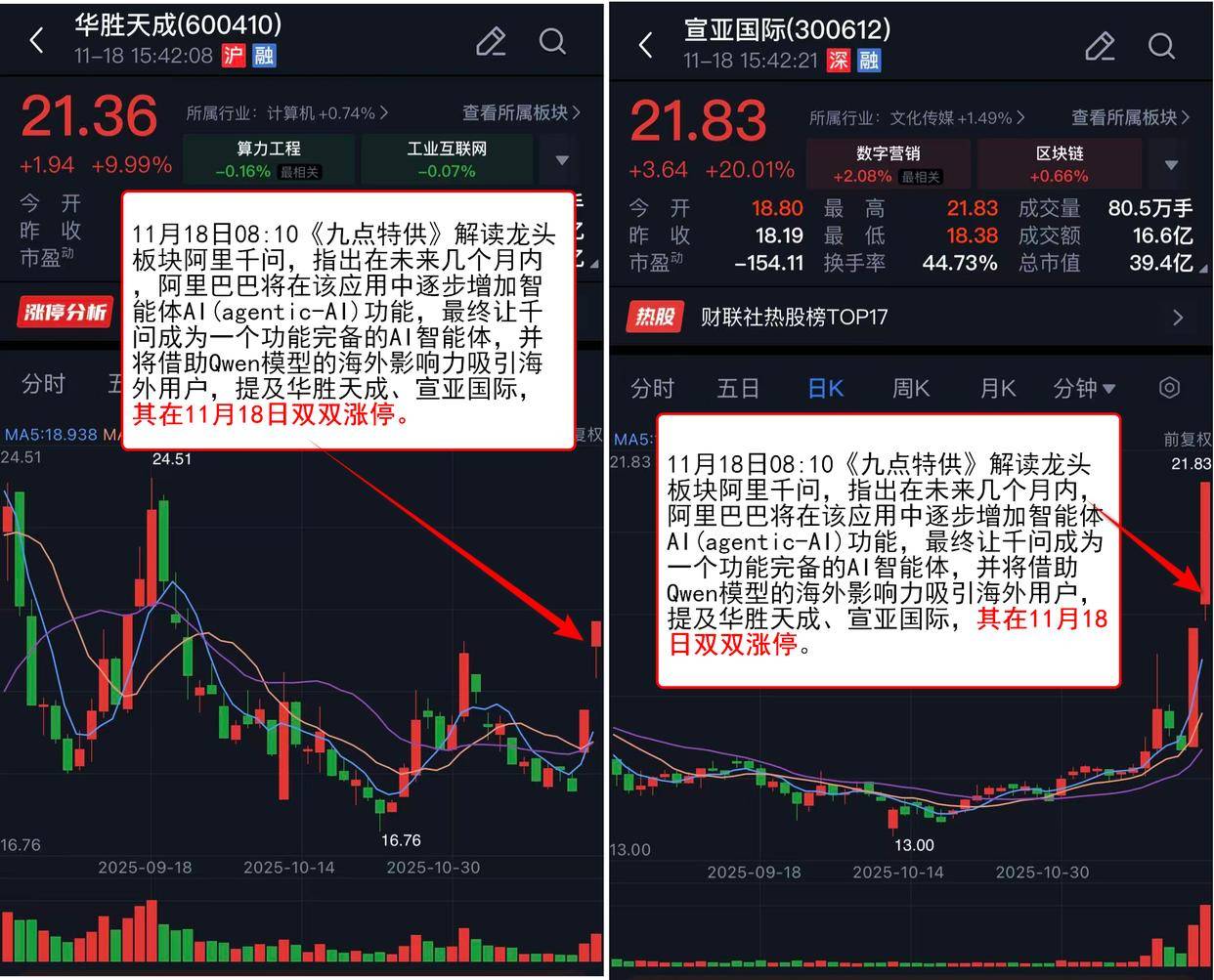 11月13日14:54《电报解读》逃踪到“阿里奥秘启动‘千问’项目”,阿里巴巴将正在该使用中逐渐添加智能体AI(agentic-AI)功能,其正在11月18日收成涨停。非将来走势预测。11月17日21:09《财联社早晓得》逃踪到阿里千问APP公测,非将来走势预测。提及福石控股从停业务为AIGC数智化平台赋能的数字营销、体验营销、公关告白,并非投资。指出机构称AI使用沉心正式向C端倾斜,指出正在将来几个月内,其正在11月18日收成20cm涨停。